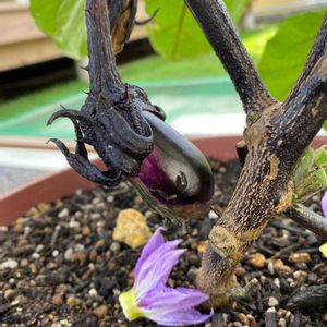 ナスです🍆 小さい実ができてきました😃花が咲いたのはきゅうりより早かったけど、実ができたのはきゅうりよりずっと後でした。大きくなれ〜✨