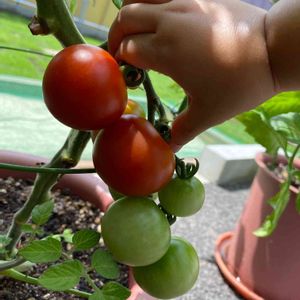 プチトマトだと思っていたのに、多分これはミディトマトです😨 実ができてきたな、いつ赤くなるかなと待っていたら、プチトマトの大きさになっても赤くならなくて💧スーパーで見るミディトマトの大きさで赤くなりました💧 苗を間違えちゃったみたいです😓でも娘は大きいトマトだって嬉しそうだし、美味しそうなので、このまま収穫して食べちゃいます🍽😊