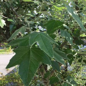 ギンドロです。ポプラの仲間だから 大木になります。 葉裏が真っ白なので、押し花絵で雪景色を表現するのにぴったりらしいです。 結構な値段で売りに出ててビックリ👛 ひこばえもたくさん出てるし、成長も早いから、いいお小遣いになるわぁ …って… ここは公園でした🙅