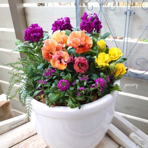 🎗️2025/01/31🎗️ 寄せ植え ✾ストック ✾ビオラマーブル ✾斑入りアラビス ✾アリッサム ✾球根から育てているラナンキュラス ✾球根から育ててているアネモネ