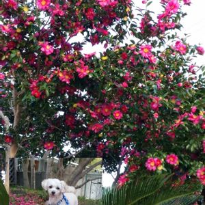 3年前の庭の山茶花& ラッキー 剪定しなかった山茶花の樹は 大きくなり過ぎ 通路に山の様に花弁を散らし お掃除が大変だったので 半分にカットしました。 (^_^;)