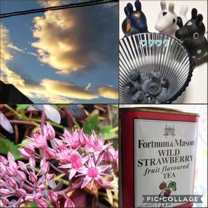 ↖️今朝の空 朝日に照らされる雲 こちら地方は台風の影響で猛暑予想だったのでまだ涼しい夜明け頃にお墓参りに出掛けたよ ↗️通りすがりの不届き者にブルーベリー食べられてるようなので、ちょっとだけ収穫してみた(いつもは私か娘がその場でパクパクしてる事が多いかな笑) ↙️カラスミセバヤが咲き始めたね ↘️🍓毎月15日はいちごの日 に参加してみよう~と探したモノ 20年以上前のデザインのフォートナム&メイソンのワイルドストロベリー、フレーバーティーの缶(サビサビよ~) 大昔、いい香りの中身も素敵な缶も好きでよく買ってたな 何植えよかな💓