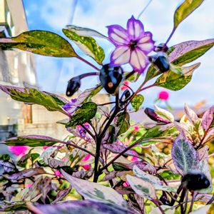 トウガラシ「カリコ」の花 可愛い〜💜恥ずかしがり屋さんなのか 下向き、写真撮るのにかなり頑張りました😂