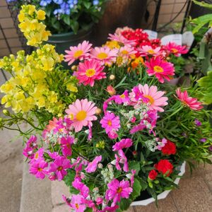寄せ植え…お花7種類 1️⃣2️⃣寄せ植え裏表…どっちが正面? ホムセンで花苗を見ていたら、寄せ植えに釘付け…連れて帰りました~😊春爛漫ですね🌼 リナリア フィリア(イエロー) マーガレット サクラソウ カーネーション オステオスペルマム マリーゴールド ロベリア