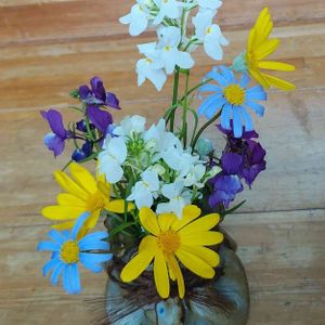 小さな焼き物の花瓶に飾りました😌 💜🤍💙💛