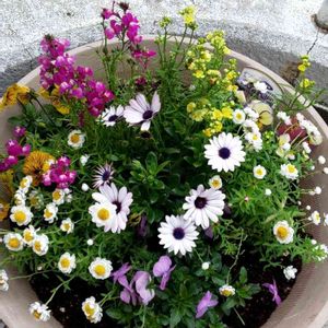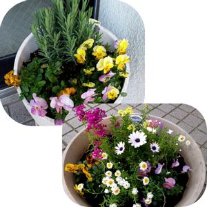 寄せ植え。このオレンジの花の名前がわからなくなってしまいました😅 追記 おそらくカレンジュラかと思いますが、花言葉を知って何だか悲しくなってしまいました😢 こんなに綺麗なのに、ね 自分用なのでまぁいっかぁ
