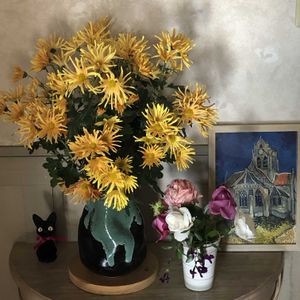 本格的な寒さで庭のお花が傷む前に切花にして家の中に。このお洒落な菊は昨年勝手に生えて来て開花した。神様のいたずら。