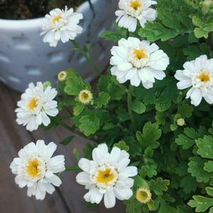 フランス小菊(マトリカリア)✨ 真冬に葉っぱだけの状態で購入、見守っていたら小花がたくさん咲いてきた! 蒸れに弱いらしいので時々内側の密なところをカットしてるけどこんな感じでいいのかな、夏越しは無理かなあ、、、😅 🏷️白い水曜日♡