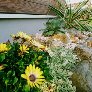 花壇を広げるため、芝生をめくり、土を盛り、一斉に植え付けました🌱 地植え後、まもなく2ヶ月が経ちます。 毎朝早く起きて眺めてます🤤 植物たちは一回り大きくなってる👍 左のボトルツリーは新芽がたくさん、グングン伸びてます! 早く幹が太くなり上へ上へ成長してほしいな! パリーもどんどん開いて葉も大きくなってきた! グレビレアも成長はやーい! この花壇は10年後は見応えが出てくるかな? とりあえずは梅雨が心配。。無事乗り切っておくれ!🙏🙏🙏
