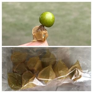 ストロベリートマト🔰ケープグースベリー(食用ホオズキ)💚 台風🌀の影響かな 落ちていた実を拾ってみたけど まだ未熟🟢 枝にはまだまだ花が咲き実っているので 完熟を待ってみよう