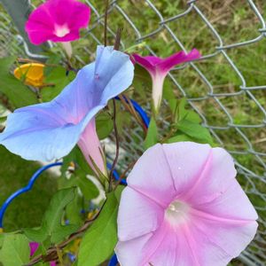 朝顔も元気いっぱい!気づくと、後ろのフェンスに巻きついちゃうから毎日チェックしないと😂