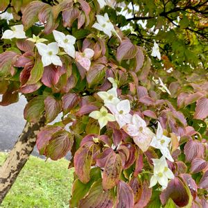 いつも二季咲きのヤマボウシ! 葉っぱも花も🍁🍂染まってる⁉️