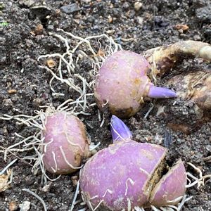 多分、シラーカンパニュラ?の球根🤔 菊芋掘るために一緒に掘り返して~忘れてそのまま💦 白かったのョ💨 球根が紫になってる(´・д・`)へー