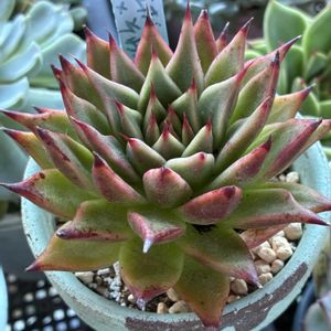 おはようございます😃 ✨交配式がわからなくなってしまった交配種✨ ミドリンの多肉が殆どの中、赤いエッジが際立ってる🥰 今週もよろしくお願いします💕