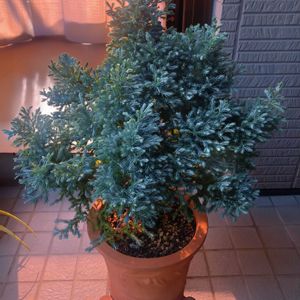 毎日暑いのでひんやりカラーを この夏には絶対ダメになるだろうと思っていたコニファー‘ボールバード’が思いのほか調子が良くてびっくり。 庭でひときわ目立つ青さはAmazing🩵✨ 早朝の弱い光で青みが増して写ってますが色補正無しですよ。 2枚目をご覧いただくと、枝の中の方の普通の緑色が見えるので、どれだけ青くなっているかが分かると思います。暑さから身を守るブルームが強く出ているんでしょうかね。 今日の予想最高気温33℃ 久しぶりに下がった⤵ かつての爽やか信州出身の身には33℃なんて本来は信じられない数字なのに 猛暑日じゃないと知りホッとする自分が怖い…