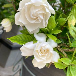 数年前に(忘れたけど…)息子から母の日にもらった八重咲きのクチナシ。 青虫に葉っぱ食べられたりなぜか蕾がポロポロ落ちたりすることが多かったけど、今年は元気だ‼️ さっそく雨に当たらない所に連れてきました😁 いい香りがする❣️