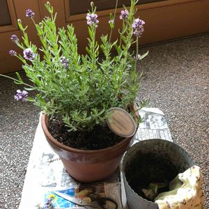 今日のお花がラベンダーという訳ではないのですが、植え替えのキッカケになったようです^^; ブリキ缶だったのと、増えてきてお水の心配もあり、Go signです👍 切ったお花はいい香りです✨✨✨ 軟弱な私は、玄関に引き込んで植え替えました〜〜😅☀️☀️☀️