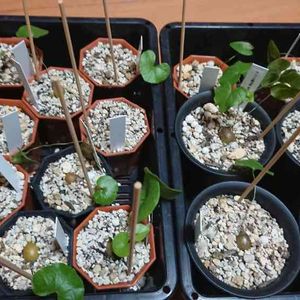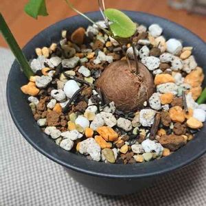 お芋掘り。 今年の8月播種の亀甲竜、これまで赤玉土100%だったので、赤玉メインの肥料入り土に植え替え。真ん中の2つはだいたい1.5cm。順調に成長中😊