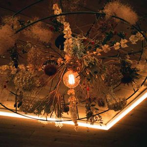 オープンしたてのカレー屋さんでみた照明が素敵すぎて写真を撮らせてもらいました 「オープン記念にもらったたくさんの花をただ捨てるのがもったいなくて照明にしたんです」とおっしゃっていて、もっともっと素敵な照明にみえました