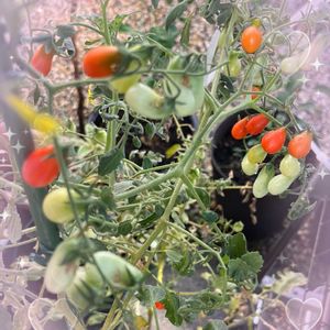 🍅ミニトマト🍅 一粒ミニトマトをそのまま植木鉢で実がなるというのを見たことがあって… 買ってきたミニトマトが劣化してしまって一粒をそのまま空いた植木鉢🪴に…。 芽が出てきたので、またまた空いた植木鉢🪴に分けて植え替え…。 庭の片隅みで😅 数ヶ月かかっていますが結構ミニトマト出来てきました🤗 形が❓😅 アイコトマトだったかな❓ 一粒味見😋 少し硬いけど酸味と甘味で一粒でもしっかりトマト🍅の味でした🥰 しばらく赤くなっていくのが楽しみです🥰 毎日のお弁当の彩に…❣️