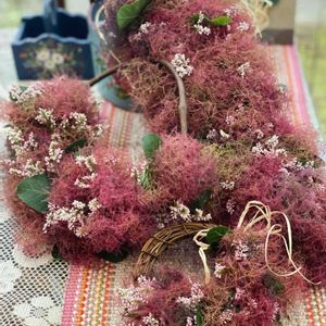 6月帰省の記録 フレッシュスモークツリーで親子レッスン 過去に何度かレッスンしていますので、今回は70cm強のガーランドに挑戦しました。 私がパーツを組み合わせて渡し母がワイヤーで巻く作業が延々続きます(母がんばりました!) 残りのスモークツリーでリースやモビールも作りました🥰