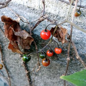林縁の赤い実🔴 真っ赤な火曜日❤️❤️❤️ 1️⃣2️⃣3️⃣ヒヨドリジョウゴ(鵯上戸) ナス科 同属 在来種 日本全土の山野に生え、葉柄で絡みついて伸びる蔓性植物 名前の由来 ヒヨドリ達が熟した赤い実に群がって食べる様子が、酒に酔った人達が騒ぐ様子に似ている事 草刈りされた山の下の🅿️に初めて見る赤い実(直径8mm) 今まで草が生い茂っていたので近づいた事が無く、遠くから見て赤い実が沢山ぶら下がっていました 花期は8〜9月で、来年こそはお花を見たいです 花はイヌホオズキに似ているので、咲いていたとしても気づかなかったかも 実はみずみずしく艶があります ルビーのように輝いています 熟す前の緑の実もツヤツヤです 全草にソラニンの毒性があるので実は食べれません ヒヨドリジョウゴの葉や茎には毛が多く、よく似たマルバノホロシには毛がないという違いがあります 2️⃣参照 4️⃣サンキライ(山帰来)の実 別名 サルトリイバラ(猿捕茨) 5️⃣ニシキギ(錦木) 一粒のみ この三つの実は同じ場所にあります