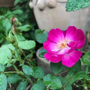 雨が降った後、夜はだいぶ涼しく感じるようになってきました🌝 バラ ビオレッタが咲いています🌹✨ すぐ散ってしまうけど次々蕾の一重美人さん😊💕 鉢が白いのは今のうちだけ💦すぐ苔むすので記念に一緒に📸😅 三角トレリスの中に置きました👐 コルジリネなど植えたいです🌿✨