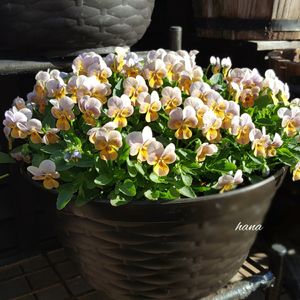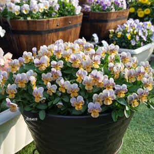 こんばんは☺️ かすみです🌼 💠ビオレッタ かすみ💠 アプリコット色?かな🎵 と~っても優しい色✨ 今日は素敵なビオラさん達たくさんみれて癒された~🍀 お花ちゃん🌷達の癒し効果は絶大だね(*´▽`)v🌼