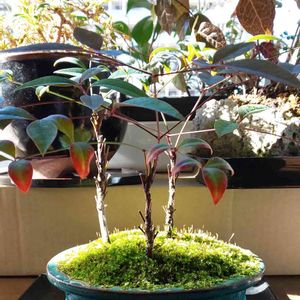 私が最初に作った盆栽らしきもの、実生のナンテン三兄弟。 庭に3本固まって芽🌱を出したのを、土ごとえぐり取って100均の鉢にそのままボコンと入れました。 4年になろうかと思います。苔はハリガネゴケがメインで、今年の春に貼り替えたもの。 今日はこの苔をズームして遊びました。😊