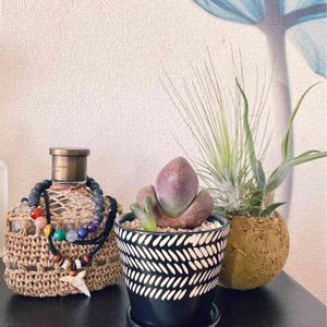 私のお気に入りスペース。今日はダイソーで可愛くしてみた!ひとさんのpicでみたダイソーのソーラーライトも見つけちゃった。明日お日様に当ててみよう! 右側には今日ゲットした小さな多肉ちゃんたちとマーブルネックレス。 今度はリメ缶作ろうかな🤔