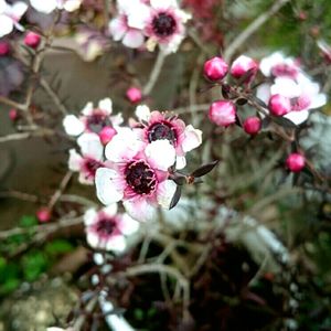 去年の秋からギョリュウバイ(レプトスペルマム)が咲き続けています。マヌカハニーが取れることでも最近は有名になりました。
