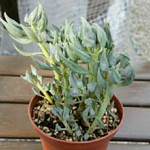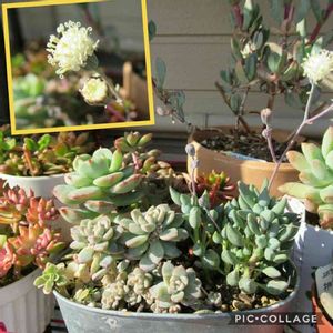 白寿楽のお花♫ ワタみたいで可愛い💖 ネックレス系のお花と似ていて、雄しべ?のところ、クルリンしています😊 同じセネシオ属だからかな。 キルヒネアは徒長してるけどま、いいか♫ プロリフェラ、下のお子様も秋に少し成長しました😄