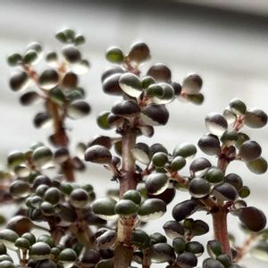 グロボーサさん☺️ ピレア属のセルピラケア・グロボーサというらしい🤔 写真で見て一目惚れ🌟 以前楽天見つけてお迎えしました。 下半分透けてるのが水晶みたいでとても綺麗✨ 冬に過保護にしたらあまり赤くならず、湿度を好むけど夏の根腐れに注意と……難しそうかも知れませんが、秋にもっさもっさ増やせるようにがんばるぞ💪