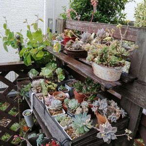 ウッドデッキの多肉棚たち 今日は給水日 雨でGW終わっちゃうね😭