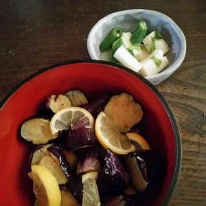 お花で無くて🙇さい 揚げ🍆ポン酢レモン絞め 市販のオクラ漬け物ショッパイから長芋と会えて これから冷蔵庫で寝て頂きます🍴🙏