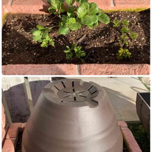 花壇の霜除け対策。 鉢被せ!!🤣 不織布とかだと止めなきゃいけないし、でも葉が伸びてきたら難しいし… これならある程度葉が伸びても行ける!!😆