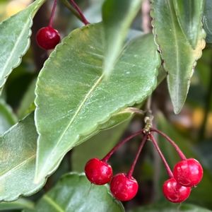 12月29日 今日のお花 🟡🔴🍃センリョウ つぶらな赤い実と緑の葉の対比が美しい、縁起をかついだ命名で、正月の飾りつけや切り花に欠かせません。初夏に枝先につく小さな花は、花弁も萼もないシンプルなものです。果実が黄熟するものもあります。 よく似たマンリョウは実が葉の陰にかくれるようにつくのに対し、センリョウは葉より高く、穂状につきます。 🏷️日曜日はビタミンカラーの日