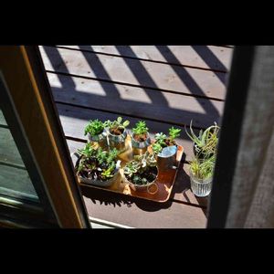 玄関は陽当たりが悪いので、多肉、サボテン少しで、雑貨をメインに置いてみました。