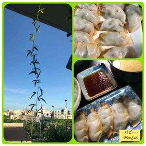 こんにちわ☀️ アプリが連日落ちてしまって、思うように返信ができずにおります。 ごめんなさい! 昨夜は散歩から戻ると、友人達が口々に「今日、夕飯餃子たべたー!」や 「王将の餃子買ってきた!やっぱ作るよりも買う方が綺麗だしいい!」 などと、餃子トークを咲かせていたので… お米だけ炊いて、散歩に出かけた私は お腹ぐぅ…です… 冷凍庫には冷凍むき海老… 冷蔵庫には麻婆豆腐にしようかと思っていた、合挽き肉… お野菜は…長ネギと人参少しと枝豆しかないよ…餃子の皮ないから作るしかないな… というわけで、餃子の皮を作って大きめのエビ餃子にしました。 おかずが色々なくて、シャケフレークとザーサイを刻んだのと、パセリとキャビアをご飯に乗っけました。 餃子の皮は [大判12個分] 強力粉60g 小麦粉50g 塩2つまみ 熱湯70cc で作りました。 30分は常温で寝かせたけど、冷蔵庫で一晩置くのが良いです。(残りは寝かせ中) 皮の作りたては柔らかくて、ヒダが作りにくーい✨ でも、ま、いっか! パリッパリで美味しいですよ〜 12等分する時に、片栗粉をまぶしてまん丸にまとめます。片栗粉を台や、まな板に振って丸めた皮を指先でなんとなく丸くのばしてから、綿棒で伸ばすとやりやすい! 私は11㎝くらいの大判にしました✨ あとは普通にフライパンに並べて皮の上から、水かお湯を投入して蓋をして蒸し焼きにします。水分が飛んで、カリカリになるまで放置する時と、カリカリでモチモチになります✨ て…餃子の話ばかり… 夕方に散歩に出た時に綺麗なピンクの花が咲いていました✨ 散歩から戻る途中川から見える、夕日がきれいでした✨ 日も暮れて、白い猫が横切りました。 もしかして、ブルーアイちゃんかな? と思ったらそうでした。 ちょっとつけてみると逃げたり、戻ったり…無理はいけないな…と帰ろうとするとマンションのベランダから視線を感じました。あ!と見ると、前髪が斜めパッツンの目つきの悪い子が私の様子を見ていました。 今まで居ないなぁ…と思ってたけど、 こんなところから見られてた可能性もあるな… そして後ろを振り返ると…ブルーアイちゃんが戻ってきて、私をこっそり見ています。 あ!来た、と思って近づくと逃げます… また諦めて、歩いて程なく振り向くと… 付いて来ています…(⑅˘͈ ᵕ ˘͈ ) そんなことを繰り返しながら、大通りを避けて帰りました。 このこは不思議な子だわ〜 やっぱり、今度シャカシャカビョーンを持って歩こうかな…