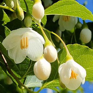 白い水曜日♡ 🪩復活のエゴノキの花🪩 一昨年、🏡留守中に 真夏の酷暑と旱で 葉っぱが茶色く枯れ瀕死だったエゴノキ😭💦🌳 幹の半分以上が枯れ、去年は葉っぱを少しつけただけ😢 今年は、生き残りの部分から新葉が展開し、蕾を付けた〜🥹と思ってたら 今日ふと見上げると、雨上がりの青空にスズナリの白い花❁が風に揺れていました🤍🎉 また咲いてくれてありがとう🌟💖