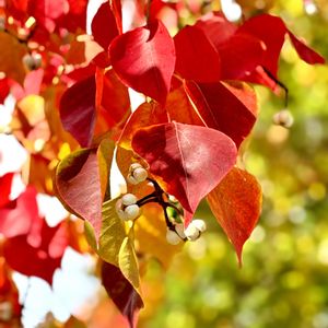 リハビリついでの 花散歩で✨ 💚💛⚫⚪🧡❤️🟢🟡🌿🍒♪ 秋は実も気になります! 1️⃣南京櫨の 紅葉の始まり 2️⃣南京櫨の実が弾け始めていました 3️⃣百日草 4️⃣木瓜の実の大きいこと😳 5️⃣冬青の実が真っ赤でサクランボのよう でした🍒 今日も 笑顔😄で 過ごせますように💐