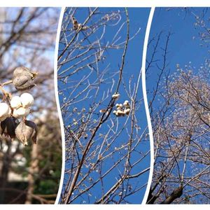 あのカラフルだった葉はみな落ちて 白い実だけが残っていました うんと見上げた 空の青と交わる辺り 細い枝の先にたっくさんの白い実が ついているのがとても綺麗でした 右端の写真を拡大してみて頂ければ 空に溶ける無数の小さな泡粒のような実が 確認して頂けると思うのですが… 上手に撮れなくてちょっと残念なのでした😢