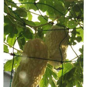 急な雨で窓越しに撮りました。 逆光なので、ホントはゴーヤの実はもっと白いです。