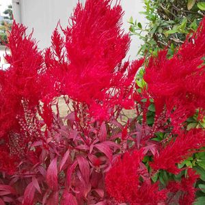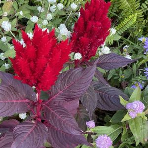 【羽毛鶏頭】《ヒユ科》 花言葉 「色あせぬ恋」「おしゃれ」「気取り」「風変わり」 別名: 鶏冠花(ケイカンカ)、韓藍(カラアイ)、セロシア 長楕円形の葉をつけた茎先に、ふさふさした羽毛のような柔らかな花穂がボリュームたっぷりの円錐形になり、花穂の下方に赤い小花が咲きます。 2021.6.18