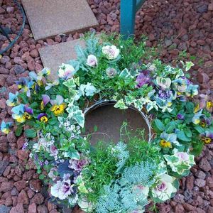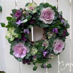 今年のハボタンリースです。 もう少し薄い色でまとめたかったけれど、結局こんな感じになりました。 そういえば、ハボタンの種まきっ子たちは徒長し放題になり、ハボタンらしくなってくれませんでした。成長を抑える薬剤も使ってみましたが、難しかったです。 プロの方々はやはり違うと実感しました。 なのでこちらで使った苗は全てお迎えしたものです。ビオラも少し入れてあります。
