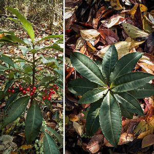 冬の森 木漏れ日の中、枯れ葉に埋もれそうな可愛らしいマンリョウがたくさん🌱 ここにいるよと緑の声💚✨聴こえるよう🌞