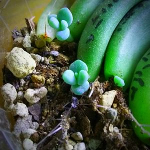 ビリデ。パキフィツム? 紅葉するとオレンジがかった紫色になります。 初秋に植え替えた時にモギモギした葉挿しの赤ちゃんも顔を出してくれました。 葉っぱの成長はゆっくりですが、根っこはボーボーです。 入れ物はLAWSONのエッグタルトの空き容器😁