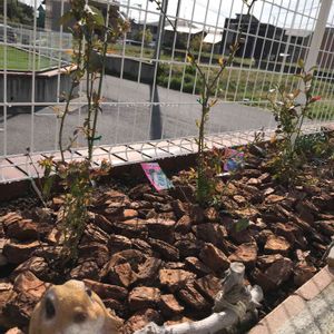 小さな庭のトップは ミニバラ✨さん達です🎵 ちょこっと見えているスリット鉢は、 ブルーベリー💜さん達です😃