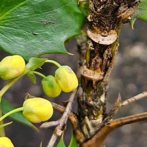 黄色の蕾のすぐ横で 「ヒイラギナンテン」の 冬芽葉痕 です 葉は奇数羽状複葉で 常緑なので落葉はしませんが 冬に赤銅色になる部分があり落葉して葉痕を作ると思われます 葉柄の付着部位は大きく 多数の維管束痕が ほぼ半周に渡りU字に並んでいます