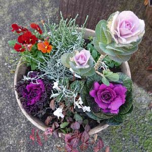 こんにちは 久々の投稿です ミニ葉牡丹を見つけたので リースにしたい❣️ と思い しかし、リース台が大きいのしかなく 組み合わせの植物を考えながら植えました〜✨まぁまぁの出来かな💕 葉牡丹でいっぱいのリースは またチャレンジします🎶😊